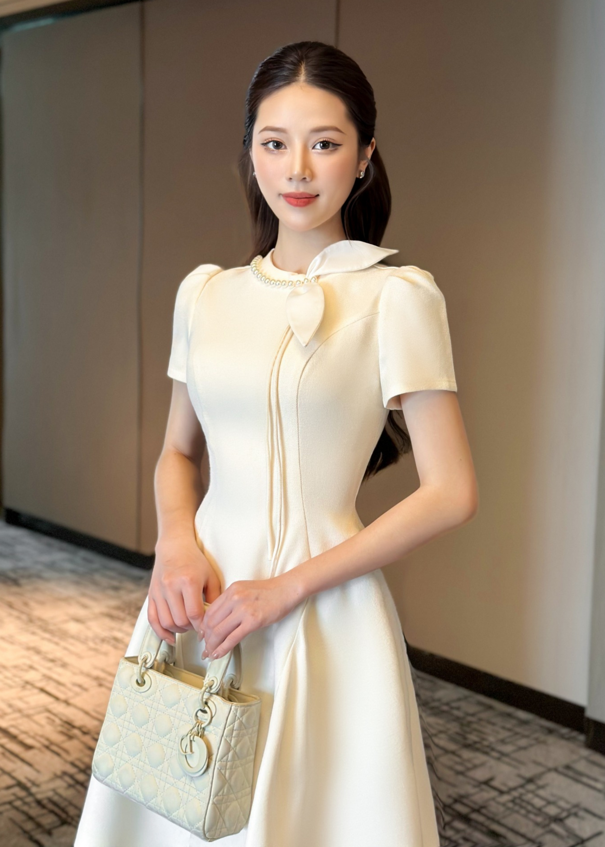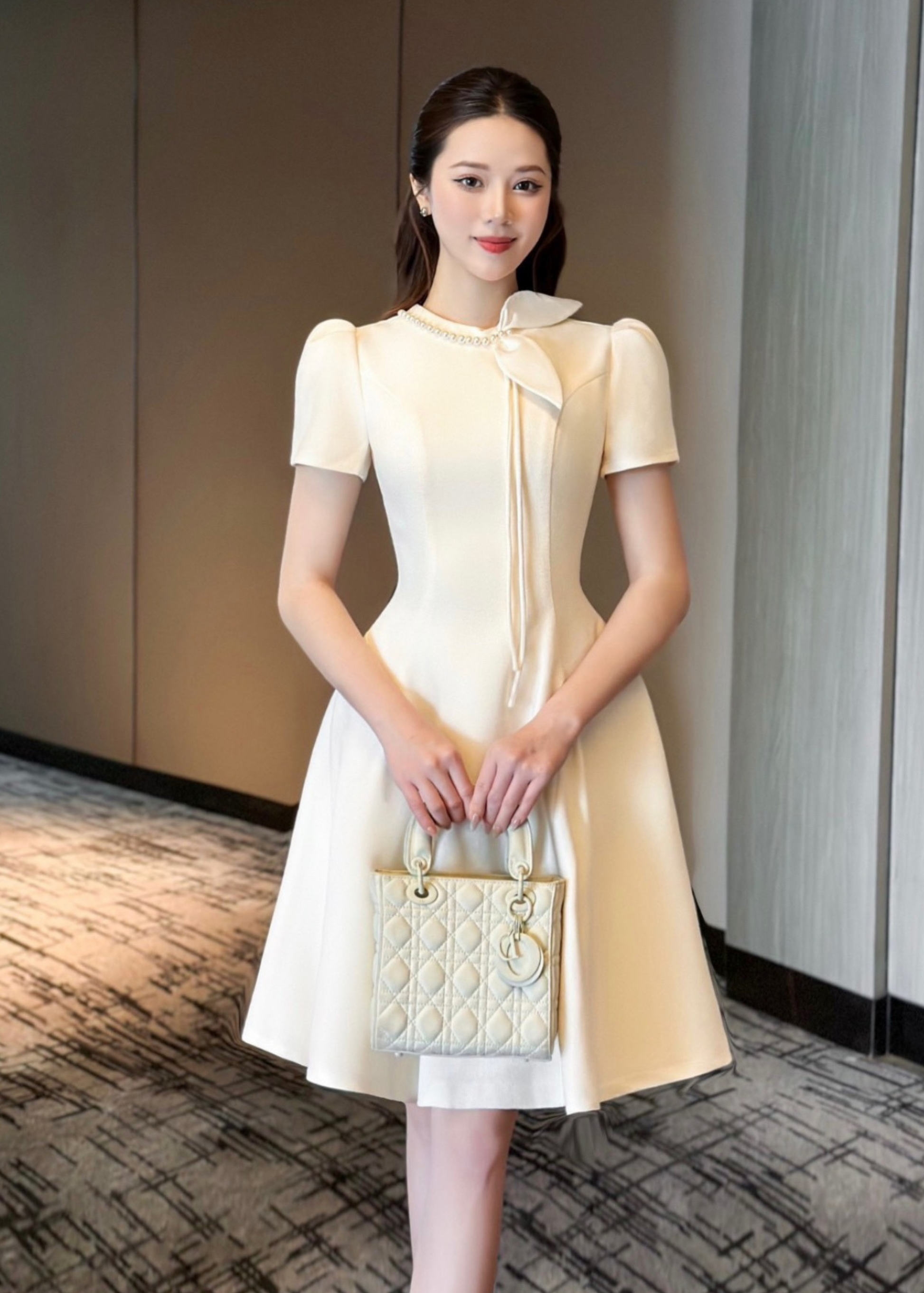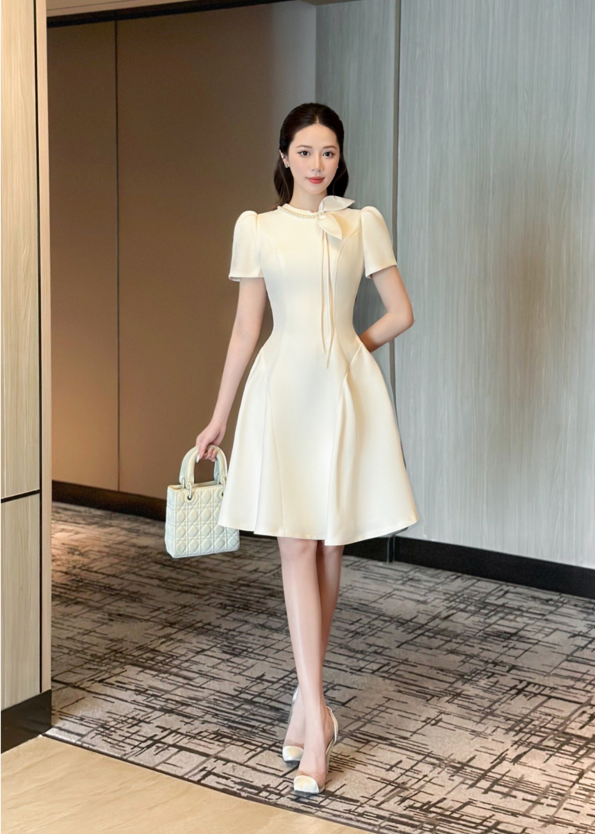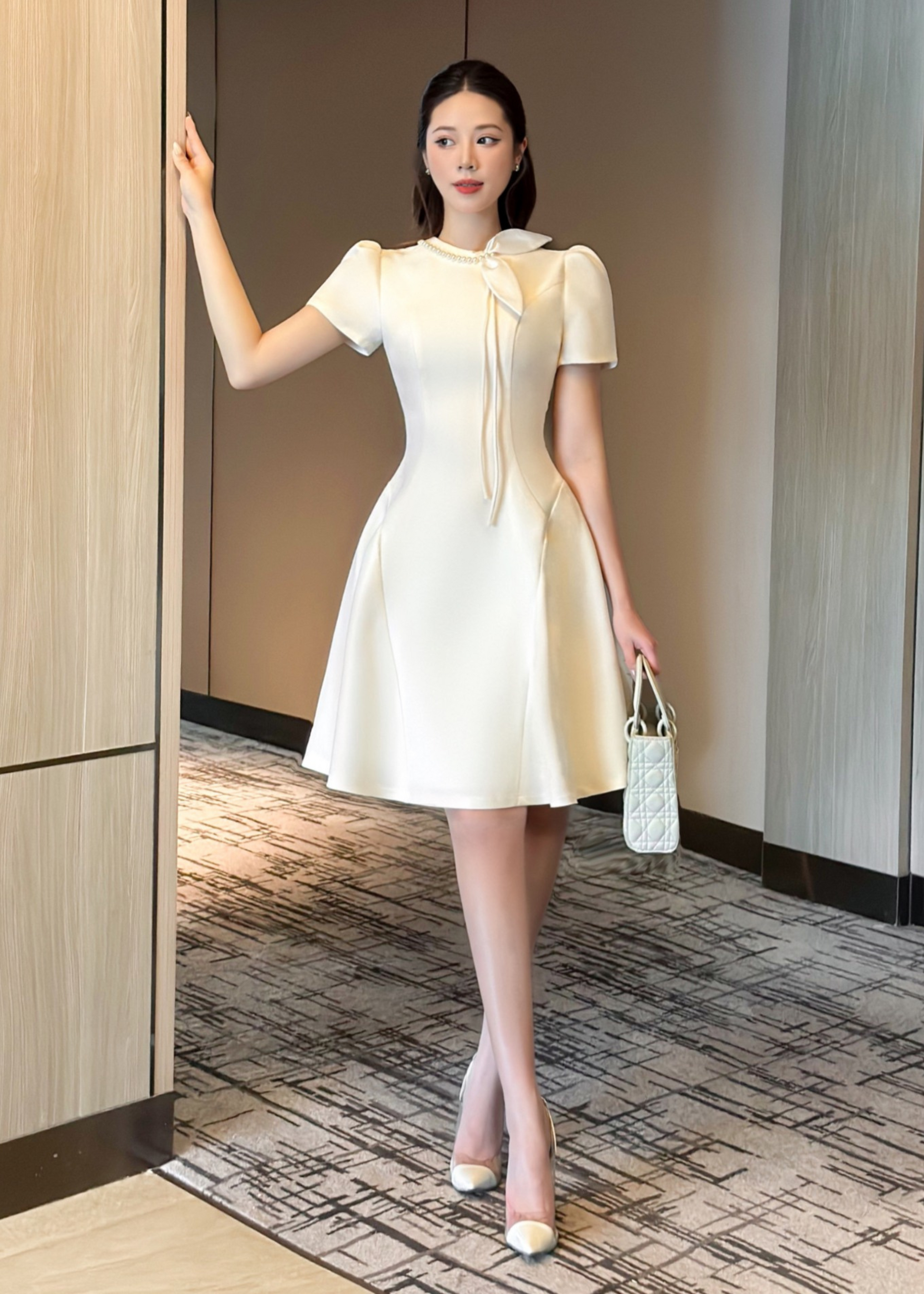 Though minimalist in design, it is far from plain: handcrafted pearl embellishments at the neckline, a delicate bow accent, and a fit-and-flare silhouette with a defined waist create a harmonious balance of charm and sophistication. Every subtle detail contributes to a polished ensemble that enhances your confidence with every appearance.